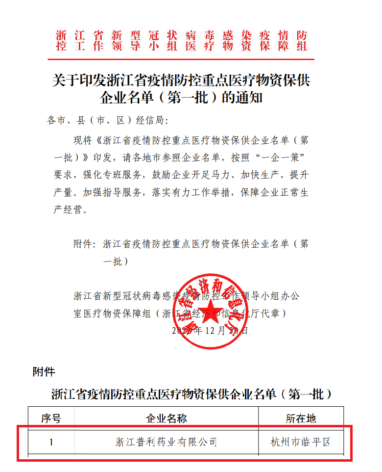 浙江省新冠疫情防控工作领导小组医疗物资保障组将浙江普利药业有限公司纳入浙江省疫情防控重点医疗物资保供企业名单(第一批),浙江普利积极响应,开足马力、加快生产、提升产量,以实际行动守护大众健康!