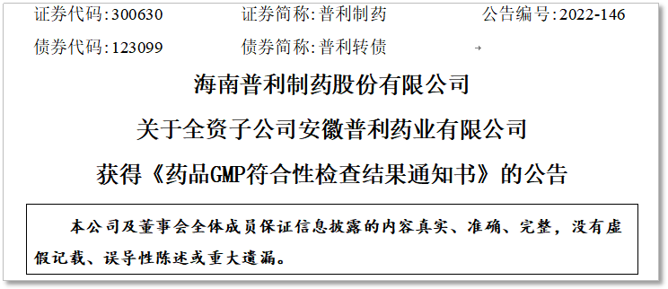 本次《药品GMP符合性检查结果通知书》获得,表明安徽普利氢氧化镁原料药产品及生产线满足GMP要求,有利于公司继续保持稳定产品质量和生产能力,满足市场需求,保证公司正常生产经营。