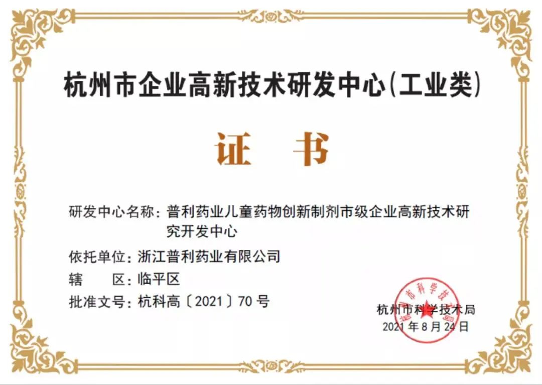 太阳集团tcy8722-积极响应国家儿童药研发政策,2016年12月,太阳集团tcy8722位于杭州的生产基地被国家工信部纳入工业转型升级—中国制造2025儿童药重点项目。2020年10月,太阳集团tcy8722成为中国儿童药物研发与产业化联盟的核心企业成员单位之一。2021年,浙江普利药业儿童药物创新制剂研发中心(杭州工厂)已经被认定为杭州市企业高新技术研发中心。